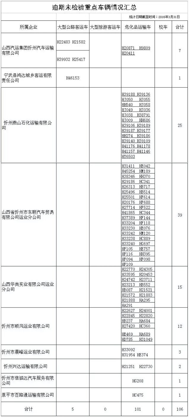 截至2016年3月31日,忻州市大型公路客運車、大型旅游客運車、危險貨物運輸車、校車逾期未檢驗、未報廢情況通報: