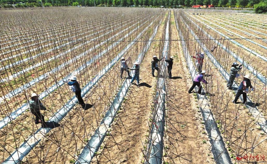 靜樂縣無絲豆角豐潤村種植基地內(nèi),農(nóng)民們正在加緊給豆角搭架子。本報記者 宮愛文攝