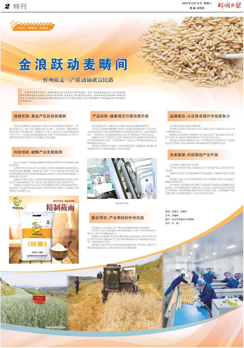 在晉西北的黃土高原上,金黃的莜麥正在為鄉(xiāng)村振興譜寫新篇章。作為“中國(guó)高原莜麥之鄉(xiāng)”,忻州憑借獨(dú)特地理氣候和雜糧文化底蘊(yùn),培育出山西鄉(xiāng)村味、富鑫農(nóng)業(yè)、晉??档三堫^企業(yè)。這些企業(yè)通過科技創(chuàng)新、品牌打造和全產(chǎn)業(yè)鏈發(fā)展,將傳統(tǒng)莜麥升級(jí)為高附加值產(chǎn)品,帶動(dòng)農(nóng)民增收,為忻州持續(xù)擦亮“中國(guó)雜糧之都”金字招牌注入強(qiáng)勁動(dòng)力。