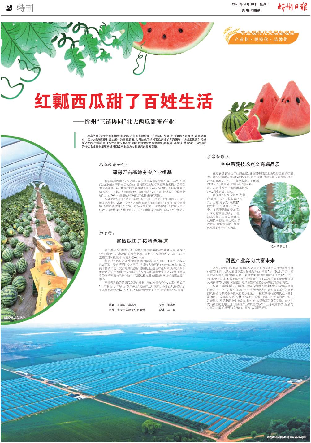 綠淼公司規(guī)劃著更廣闊的土地流轉(zhuǎn)和西瓜全鏈條發(fā)展;定襄農(nóng)富合作社的“空中西瓜”技術(shù)有望在更多地方開花結(jié)果;奇村鎮(zhèn)加禾村的富硒西瓜種植與多元市場模式正穩(wěn)步推進。一顆顆從忻府區(qū)現(xiàn)代化大棚和富硒瓜田、定襄縣立體“瓜林”中孕育出的忻州西瓜,不僅是饋贈市場的甜蜜果實,更是驅(qū)動農(nóng)業(yè)增效、農(nóng)村變美、農(nóng)民致富的強勁引擎。在這片充滿希望的土地上,忻州西瓜產(chǎn)業(yè)的“三駕馬車”,正承載著科技、品牌與共享的力量,向著更加甜蜜的共富未來,穩(wěn)健馳騁。