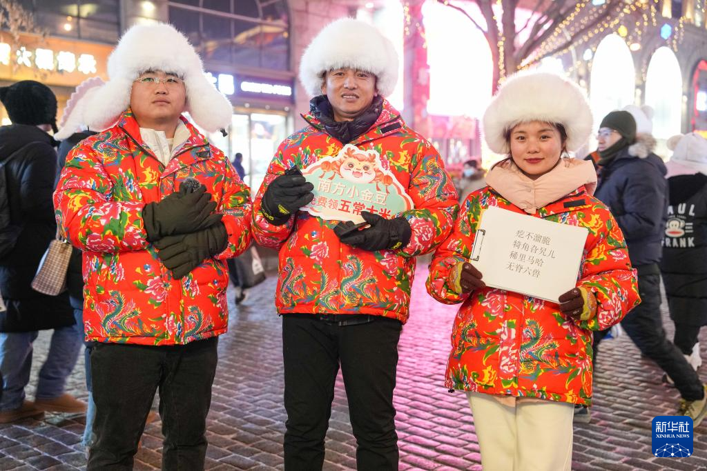 在哈爾濱市道里區(qū)中央大街,當(dāng)?shù)厝送ㄟ^東北方言問答送禮品的方式歡迎外地游客(1月3日攝)。新華社記者 謝劍飛 攝