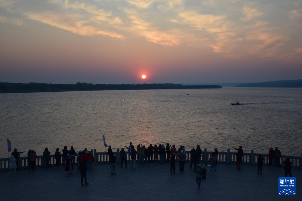 游客在“華夏東極”黑龍江撫遠(yuǎn)觀賞日出美景(5月19日攝)。新華社發(fā)(官長青攝)