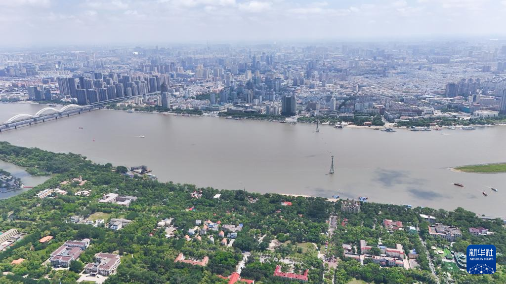 這是6月4日拍攝的哈爾濱市松花江北岸的太陽島國家濕地公園局部景色與對岸的局部城市景觀(無人機(jī)照片)。新華社記者 王松 攝