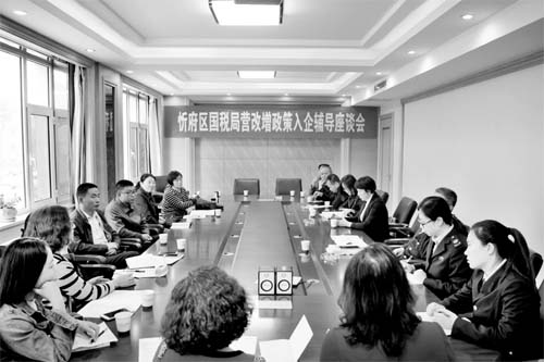 本報訊 4月19日下午,忻府區(qū)國稅局營改增政策入企輔導(dǎo)座談會在忻州國力房地產(chǎn)開發(fā)有限公司會議室召開。區(qū)局黨組書記、局長郭靜出席,政策法規(guī)科科長王繼紅主持會議,稅源管理科負責(zé)人和房地產(chǎn)企業(yè)代表一同參加。
