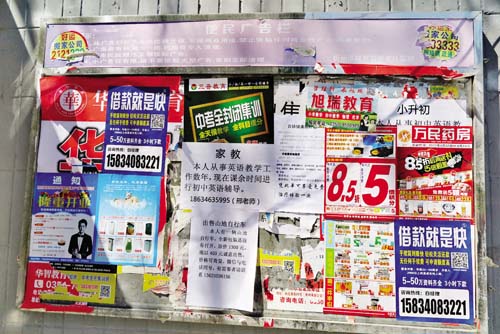 情況一:記者近日在忻州城區(qū)和平街一路口看到,一塊為市民提供告知服務的“便民公告欄”明確提示不允許張貼任何商業(yè)廣告,可是如今上面卻貼滿了商業(yè)廣告,而且張貼得極不整齊,這成為影響市容環(huán)境的一處死角,希望相關部門及時清理,也希望廣大市民按要求發(fā)布便民信息。