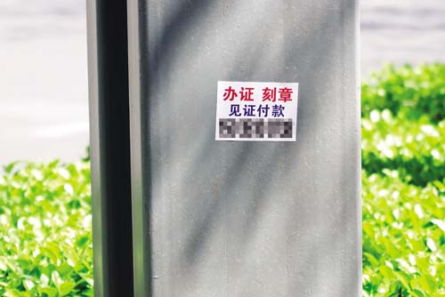 情況二:經過創(chuàng)衛(wèi)整治,在清理了小廣告之后被粉刷一新的一些宣傳欄金屬框架上,赫然再現“辦證、刻章、見證付款”等垃圾小廣告,大煞風景,影響市容,令人氣憤。