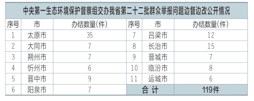 中央第一生態(tài)環(huán)境保護(hù)督察組交辦我省第二十二批群眾舉報(bào)問(wèn)題119件,辦結(jié)119件。公示119件,其中太原市35件、大同市7件、朔州市7件、忻州市6件、晉中市9件、陽(yáng)泉市7件、呂梁市12件、長(zhǎng)治市15件、晉城市7件、臨汾市8件、運(yùn)城市6件。可登錄山西省人民政府網(wǎng)站或掃描二維碼查閱群眾信訪舉報(bào)轉(zhuǎn)辦和邊督邊改公開(kāi)情況一覽表。
