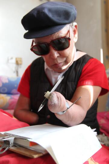 父親有句名言:“我缺手缺腳不缺鈣!”有人說他是鋼人,有人說他是特殊材料的人,他的意志確實不是一般的剛強,無人能比!冬閑時帶領(lǐng)村民打水井,他親自下井指揮,上來后鐵腿取不下來,與腿凍在了一起,血肉模糊的,我們都心疼得哭,他說疼才好呢,疼就知道自己還活著。為了制訂山地改造計劃,親自爬山越嶺地考察,他帶著17斤重的鐵腿,爬山太不容易了:站著走腿被磨疼了,就卸下鐵腿掛在脖子上跪著走;跪著走磨破了皮肉就爬著走;下山的時候就更困難了,站著走經(jīng)常摔跤,又不能跪著走或爬著走,他干脆扔下鐵腿身體抱成團滾著走。他經(jīng)常是四肢的創(chuàng)傷面剛結(jié)痂,又被磨破,流血化膿是常有的事。站著走,跪著走,爬著走,滾著走,這是父親當(dāng)年的四種走法……