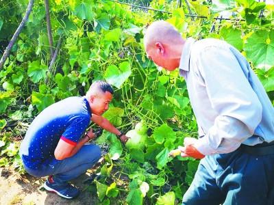 山西省總工會(huì)派駐宋家溝村第一書(shū)記楊濤(左)幫助村民引進(jìn)葫蘆種植,以豐富旅游產(chǎn)品。光明日?qǐng)?bào)記者 李建斌攝