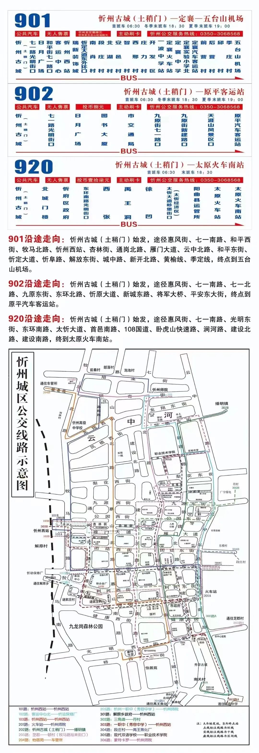 據(jù)悉,忻州古城至太原火車南站城際公交線路名稱為920路,運(yùn)行里程87公里,單程票價(jià)17元,投入20輛公交車,雙向?qū)Πl(fā)。首班發(fā)車時(shí)間6:30,末班發(fā)車時(shí)間18:30,發(fā)車間隔半小時(shí),沿途設(shè)11個(gè)站點(diǎn);忻州古城至原平汽車客運(yùn)站城際公交線路名稱902路,運(yùn)行里程55公里,單程票價(jià)8元,投入10輛公交車,雙向?qū)Πl(fā)。夏季首班發(fā)車時(shí)間6:30,末班發(fā)車時(shí)間19:00。冬季首班發(fā)車時(shí)間6:30,末班發(fā)車時(shí)間18:30,發(fā)車間隔半小時(shí),沿途設(shè)立9個(gè)站點(diǎn);忻州古城至定襄及五臺(tái)山機(jī)場(chǎng)城際公交線路名稱為901路,運(yùn)行里程62公里,單程票價(jià)6元,其中忻州到定襄縣城票價(jià)4元,投入10輛公交車,雙向?qū)Πl(fā)。夏季首班發(fā)車時(shí)間6:30,末班發(fā)車時(shí)間19:00。冬季首班發(fā)車時(shí)間6:30,末班發(fā)車時(shí)間18:30,發(fā)車間隔1小時(shí),沿途設(shè)立24個(gè)站點(diǎn)。