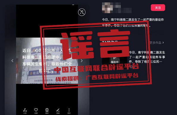 真相:近期,有網(wǎng)民在短視頻平臺(tái)上發(fā)布視頻稱“某派出所三人在路口巡邏中,突然車輛發(fā)生爆炸,導(dǎo)致三位民警全部犧牲”。經(jīng)南寧公安部門調(diào)查,該信息為謠言。網(wǎng)民韋某為吸引關(guān)注,杜撰此條謠言信息,并利用手機(jī)進(jìn)行發(fā)布。根據(jù)《中華人民共和國(guó)治安管理處罰法》第二十五條,屬地公安機(jī)關(guān)已依法對(duì)韋某處以行政處罰。(來源:廣西互聯(lián)網(wǎng)辟謠平臺(tái)、南寧網(wǎng)警)