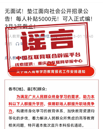 真相:近日,“墊江招聘信息網(wǎng)”微信公眾號發(fā)布信息:“無面試!重慶墊江面向社會公開招錄公告!每人補貼5000元!可入正式編!”部分網(wǎng)民看到該信息后誤認為,墊江面向社會以補貼形式招錄具有正式編制的公務(wù)人員,于是紛紛向墊江縣有關(guān)部門致電咨詢招錄情況。經(jīng)核實,近年來,墊江未曾以補貼方式和不經(jīng)過面試招錄具有正式編制公務(wù)人員。該信息實則為成人學(xué)歷提升培訓(xùn)信息,而非正式編制公務(wù)人員招錄信息。墊江縣互聯(lián)網(wǎng)信息辦公室已依法對發(fā)布該信息的微信公眾號負責人進行約談和教育批評,指出虛假信息的危害性,并責令刪除相關(guān)信息。(來源:重慶辟謠)
