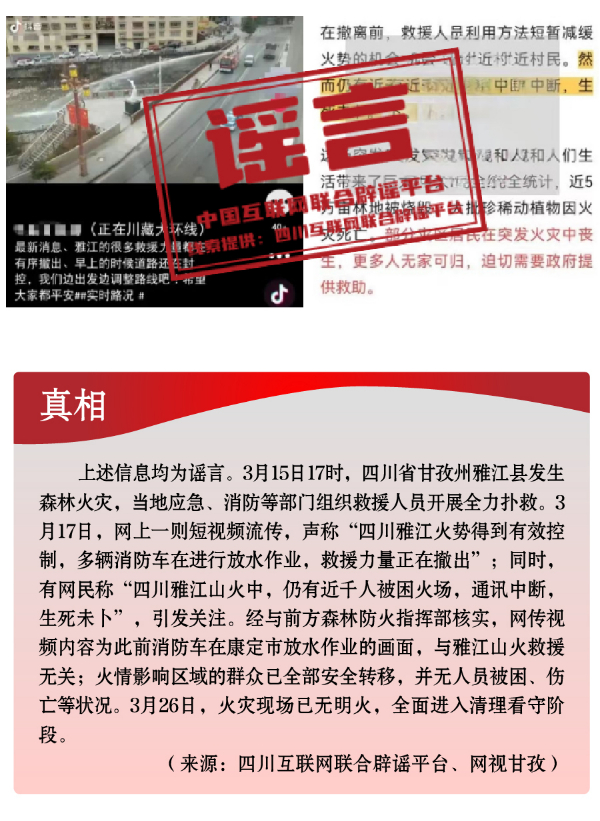 為博流量炮制安全類謠言,引發(fā)恐慌。春季歷來是森林火災高發(fā)時段。加之開春后,工廠企業(yè)復產復工,致災因素明顯增多。3月,全國多地發(fā)生火災事故,一些網民為蹭熱點、博流量,趁機編織謠言,引發(fā)公眾恐慌。3月中旬,四川省甘孜州雅江縣發(fā)生森林火災,在當地應急、消防等部門組織救援人員全力撲救之際,卻有人編造“四川雅江山火救援力量正在撤出”“雅江仍有近千人被困火場”“雅江山火有三名撲火人員犧牲”等失實信息,嚴重干擾災害應急響應和救援工作。“重慶南坪商業(yè)大樓火災傷亡慘重”“湖南省長沙市天心區(qū)發(fā)生重大刑案,警方發(fā)布懸賞通告”“天津一銀行發(fā)生搶劫”等嚴重失實的涉公共安全類視頻流傳網絡,或是造謠者自編自導,或是利用AI技術偽造,卻引發(fā)群眾恐慌、造成惡劣影響。此外,“綠得發(fā)黑的菠菜不能吃”“清明蔗、毒過蛇”等食品安全類謠言,則是利用了時令和人們對食物中毒的擔憂情緒,夸大其詞、危言聳聽,目的都是販賣焦慮、制造恐慌,進而吸引眼球、騙取流量。