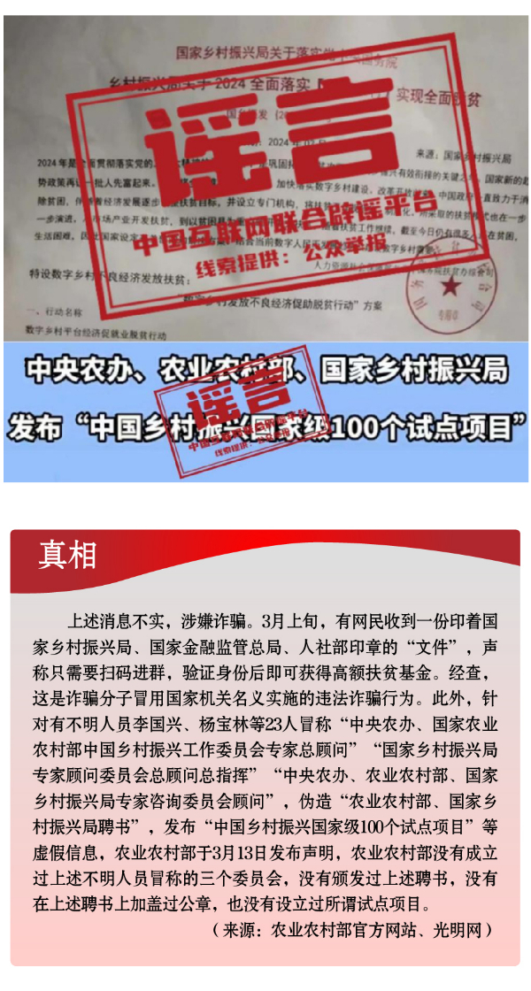 假冒權威杜撰政策類謠言,誤導公眾。3月以來,一些不法分子或機構打著權威旗號,假冒國家機關、偽造政府公文、歪曲解讀政策,企圖行騙牟利。如,詐騙分子冒用國家機關名義,假稱“國家發(fā)放2024年鄉(xiāng)村振興扶貧補貼”“鄉(xiāng)村振興項目有國家級試點100個”“‘退稅綠色通道’加快退稅到賬速度”等,實施違法詐騙行為,給社會公眾造成極大信息和資金安全風險。還有人制造、傳播“我國城鄉(xiāng)居民醫(yī)保參保人數近年來持續(xù)下降,部分地區(qū)農村出現醫(yī)保退保潮”“失業(yè)保險金只能領一次,最多領24個月”“我國社?;鹑冀唤o外資機構管理”等一系列與事實嚴重不符的涉公共謠言,迷惑性大、蠱惑性強,極易誤導公眾,對我國現有社保政策和相關工作造成負面影響。