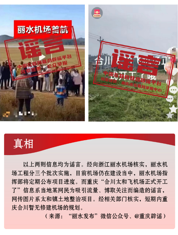 搭蹭熱點散播民生類謠言,渲染焦慮。3月,全國兩會召開,“民生清單”熱度高?!按赫小薄按河巍钡葧r間節(jié)點,有關招工就業(yè)、疫病傳染等內容也成為個別網民博眼球的素材。一些個人或自媒體歪曲甚或虛構事實,編造散布社會民生謠言,引發(fā)公眾不必要的焦慮。如,別有用心者惡意虛構事實,發(fā)布“重慶80%的工廠暫停招聘”“湖南郴州疫情卷土重來”等虛假信息,渲染負面情緒、徒增公眾憂慮、擾亂社會秩序;還有人為吸引流量、博取關注,根據主觀臆想,采取移花接木等手段,散播“京滬高速公路停止收費”“浙江麗水機場已建成投用并首航”“重慶合川太和飛機場正式開建”等涉重大基礎設施建設項目的假消息,誤導公眾認知,擾亂群眾交通出行秩序。