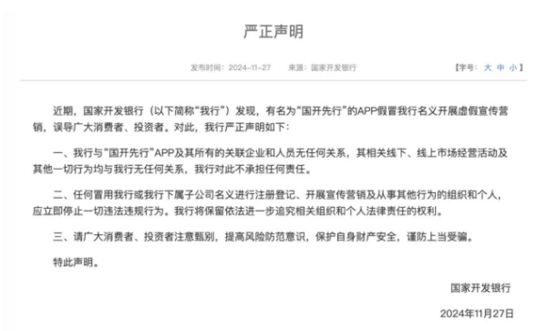 詳情:近期,有名為“國開先行”的APP假冒國家開發(fā)銀行名義開展虛假宣傳營銷,誤導(dǎo)廣大消費者、投資者。對此,國家開發(fā)銀行于11月27日在官網(wǎng)發(fā)布《嚴正聲明》: