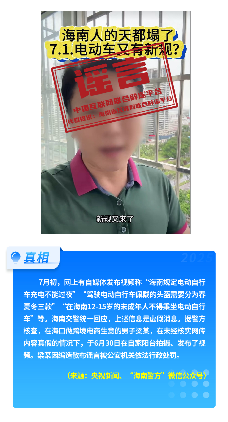 有人重新翻炒“醫(yī)?!畟€(gè)人賬戶’將全部取消”舊謠,故意歪曲醫(yī)保改革真實(shí)內(nèi)涵,嚴(yán)重誤導(dǎo)公眾對(duì)醫(yī)保改革政策的理解?!坝袑?zhuān)人上門(mén)服務(wù)激活醫(yī)保碼”,披著“公共服務(wù)”的外衣,實(shí)有詐騙之嫌和安全風(fēng)險(xiǎn)。憑空捏造“海南規(guī)定電動(dòng)自行車(chē)充電不能過(guò)夜、頭盔分三季”這一“奇葩規(guī)定”,以“新規(guī)”話術(shù),擾亂交通管理秩序。