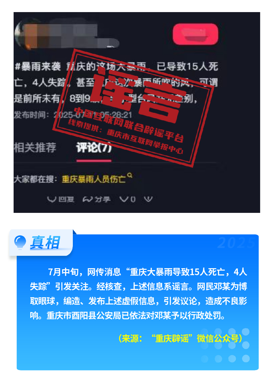 近期,網(wǎng)上接連出現(xiàn)發(fā)布虛假“警情通報(bào)”的惡性造謠傳謠案件,炮制傳播“昆明駕車(chē)撞人案131人死亡”“杭州自來(lái)水接入糞水”及涉釋永信虛假“警情通報(bào)”,模仿“藍(lán)底白字”格式,杜撰聳人聽(tīng)聞細(xì)節(jié),損害政府公信力,嚴(yán)重?cái)_亂社會(huì)秩序。“院士預(yù)測(cè)廣東將發(fā)生8級(jí)以上大地震”公然偽造專(zhuān)家聊天截圖,謊報(bào)地震預(yù)警。還有造謠者借盛夏高溫酷暑與洪澇災(zāi)害,編造“安徽淮北、山東泰安等地多人因高溫死亡” “重慶大暴雨導(dǎo)致15人死亡、4人失蹤”等謠言,蹭炒熱點(diǎn)、煽動(dòng)情緒。