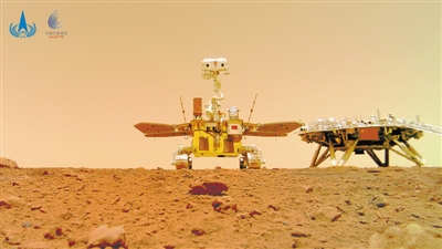 距離火星表面還有1.5千米時,一路保護著我們、像龜甲一樣的背罩連帶著降落傘被拋掉。與此同時,主發(fā)動機打開,強大的反作用力使我們的速度逐漸降低,光學成像敏感器開始對下方進行成像。在距離火星表面還剩100米的時候,著陸平臺懸浮在空中,對腳下的地表進行激光三維成像,選擇最佳的著陸位置。位置確定后,著陸平臺在主發(fā)動機的精妙控制下開始緩緩下降。終于,隨著一團塵埃被氣流濺起,著陸平臺的4只腿穩(wěn)穩(wěn)落在了火星烏托邦平原?;鹦墙K于迎來了它的第一位中國客人。