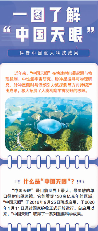 “中國天眼”全稱是500米口徑球面射電望遠鏡,簡稱FAST。FAST采用全新的設計理念,是當今世界最大的、最靈敏的單口徑球面射電望遠鏡,能夠在無線電波段搜索來自百億光年之外的微弱信號。