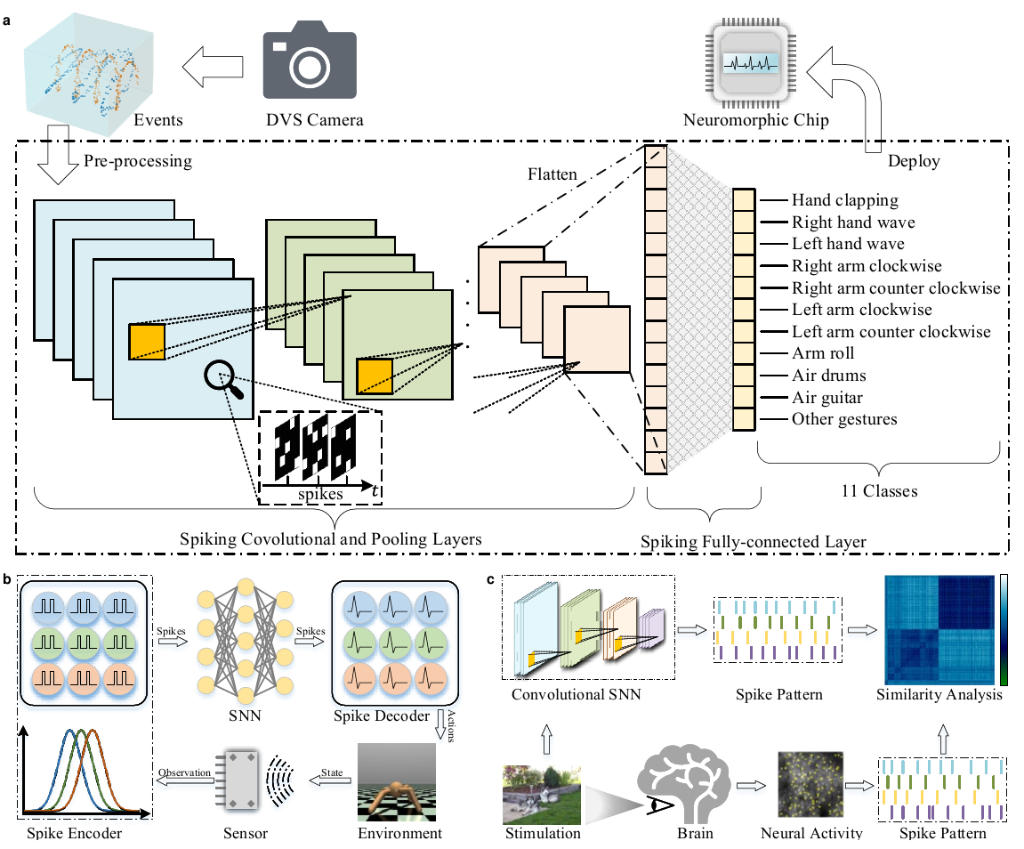李國齊介紹,傳統(tǒng)脈沖神經(jīng)網(wǎng)絡框架更多地關(guān)注生物可解釋性,并不支持自動微分,無法充分利用GPU的大規(guī)模并行計算能力,也缺乏對神經(jīng)形態(tài)傳感器和計算芯片的支持?!绑@蟄”框架很大程度上解決了上述問題,支持神經(jīng)形態(tài)數(shù)據(jù)處理、深度脈沖神經(jīng)網(wǎng)絡構(gòu)建和神經(jīng)形態(tài)芯片部署等多項功能。