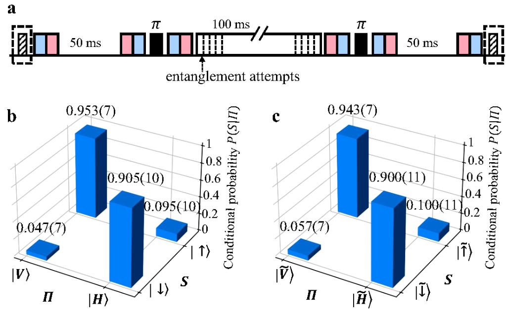 實(shí)驗(yàn)發(fā)現(xiàn),通過(guò)此方法制備出的通訊比特,可在數(shù)百毫秒的時(shí)間內(nèi)生成離子-光子糾纏;通過(guò)自旋回波方法可延長(zhǎng)存儲(chǔ)比特的存儲(chǔ)壽命,實(shí)現(xiàn)相干時(shí)間達(dá)到秒量級(jí)的存儲(chǔ)量子比特。通過(guò)比較有無(wú)離子-光子糾纏生成操作時(shí)存儲(chǔ)比特的保真度變化,研究人員證實(shí)了兩種量子比特之間低于實(shí)驗(yàn)精度的串?dāng)_誤差,從而實(shí)現(xiàn)了無(wú)串?dāng)_的量子網(wǎng)絡(luò)節(jié)點(diǎn)。