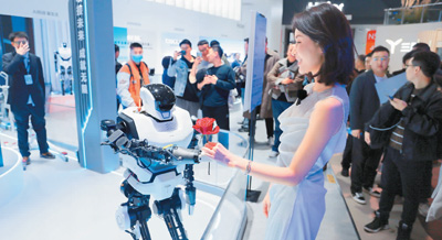 3月14日,在上海市舉辦的中國(guó)家電及消費(fèi)電子博覽會(huì)上,海爾公司的AI人形家庭機(jī)器人現(xiàn)場(chǎng)向人們贈(zèng)送玫瑰。陳玉宇攝(人民視覺(jué))