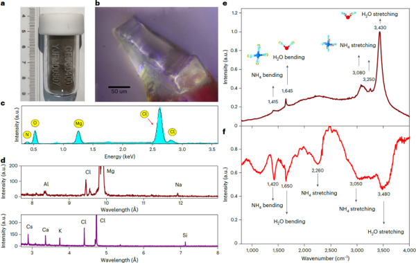 ULM-1的照片和成分組成。(中國科學(xué)院物理研究所供圖) 月球上是否存在水?這一問題對于月球演化研究和資源開發(fā)至關(guān)重要。嫦娥五號的著陸點(diǎn)位于月球正面風(fēng)暴洋克里普地體的東北部地區(qū),該地區(qū)被認(rèn)為是月球表面最年輕的玄武巖單元之一。這為相關(guān)研究提供了新機(jī)遇。 團(tuán)隊(duì)研究發(fā)現(xiàn),ULM-1的分子式中含有多達(dá)6個結(jié)晶水,水分子在樣品中的質(zhì)量比高達(dá)41%。從晶體的紅外光譜和拉曼光譜上,均可以清晰觀察到源于水分子和銨的特征振動峰。