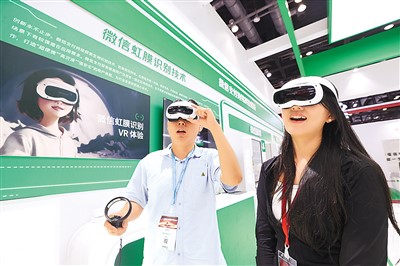 隨著數(shù)字金融領(lǐng)域創(chuàng)新成果不斷投入應(yīng)用,刷掌支付、虹膜識(shí)別支付等支付手段逐步走進(jìn)居民生活。圖為觀眾在2024中國(guó)國(guó)際金融展上通過(guò)虛擬現(xiàn)實(shí)設(shè)備體驗(yàn)微信虹膜識(shí)別技術(shù)。陳曉根攝(人民視覺(jué))