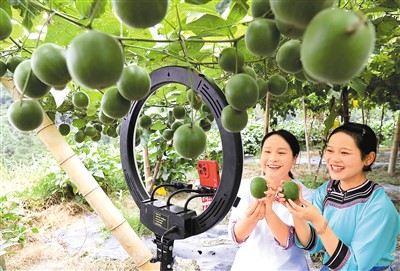 互聯(lián)網(wǎng)平臺(tái)互聯(lián)互通,將為電子商務(wù)從業(yè)者和消費(fèi)者帶來(lái)更多便利。圖為日前,在貴州省黔東南苗族侗族自治州榕江縣仁里水族鄉(xiāng)通倒村羅漢果種植基地,工作人員在直播推介當(dāng)?shù)爻霎a(chǎn)的羅漢果。李長(zhǎng)華攝(人民視覺(jué))