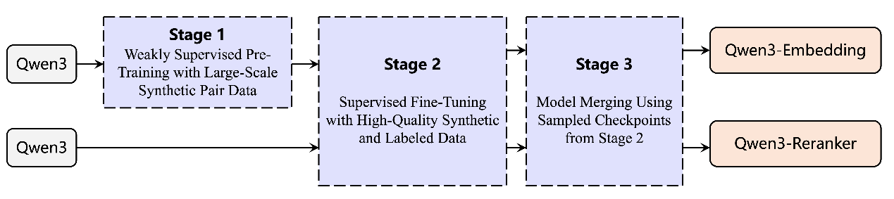 向量模型像是AI的“翻譯器”,它可以將文本、圖片等人類可認(rèn)知的非結(jié)構(gòu)化信息,映射到機(jī)器更易理解的向量空間,再基于這些向量實(shí)現(xiàn)高效的信息分類、檢索或排序。也正因此,向量模型對于提升AI的語義理解、信息檢索、多模態(tài)融合等核心能力至關(guān)重要?;谇?模型,通義團(tuán)隊(duì)通過對比訓(xùn)練、SFT、模型融合等方法,打造出全新的千問3向量模型,包含文本嵌入模型 Qwen3-Embedding以及文本排序模型Qwen3-Reranker。