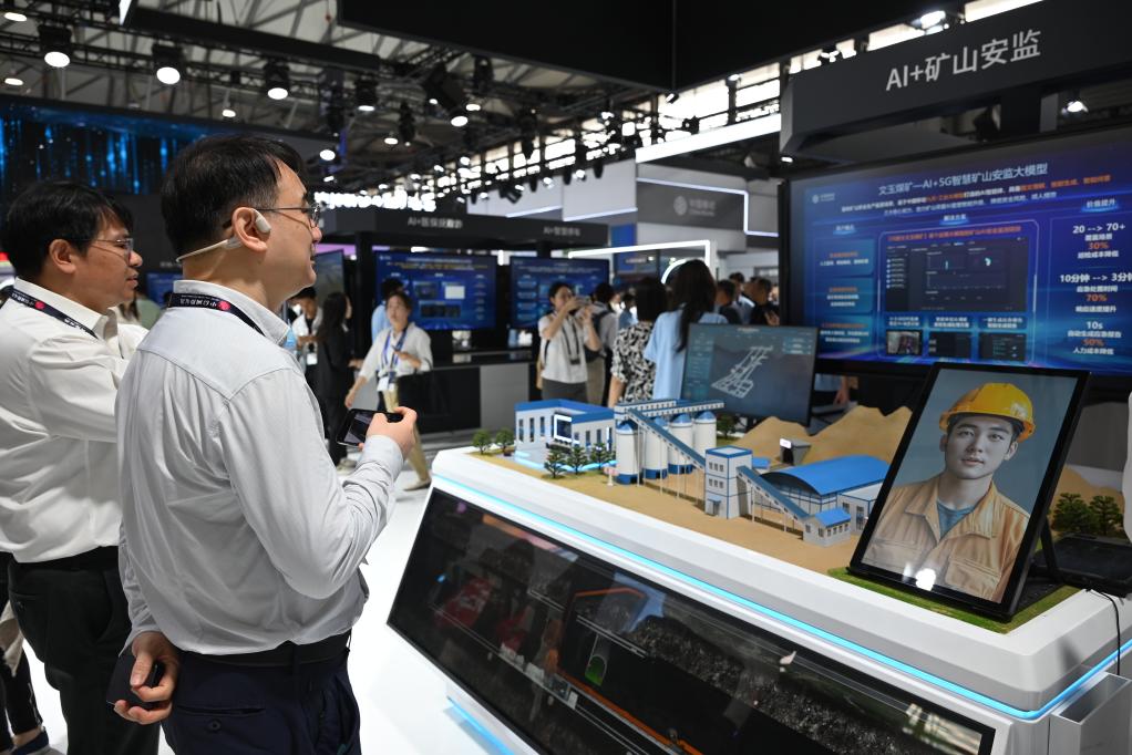 6月18日,觀眾在中國(guó)移動(dòng)展臺(tái)了解“AI+礦山安監(jiān)”技術(shù)方案。新華社記者 陳愛(ài)平 攝