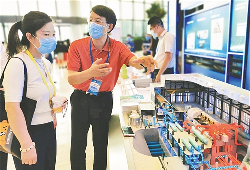 國家電投集團的專家在模型前向參觀者介紹國家科技重大專項成果——國和一號(CAP1400)壓水堆核電站。經濟日報記者 佘惠敏攝
