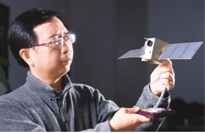 中科院院士潘建偉在辦公室內(nèi)與“墨子號”量子衛(wèi)星模型合影。(新華社記者 張端 攝)