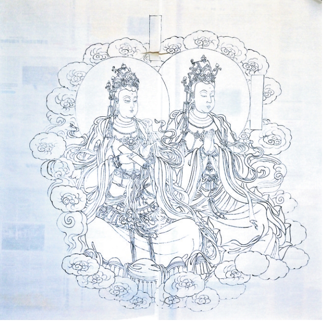 在李向東看來,臨寫是為了學(xué)習(xí)而不是“復(fù)制”壁畫。面對(duì)殘破或年久漫漶不清的畫面,他從蛛絲馬跡入手反復(fù)揣摩,根據(jù)壁畫整體的線描、造型特點(diǎn),一一補(bǔ)而畫之,最后定稿。從這個(gè)意義上說,李向東也使殘破的公主寺壁畫得以復(fù)原,“補(bǔ)壁”之功不可小覷。
