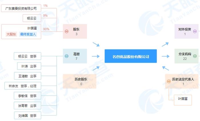 曾經(jīng)的“哎呀呀”已經(jīng)成了時(shí)代的眼淚,但在2013年,一個(gè)更強(qiáng)的名創(chuàng)優(yōu)品誕生了。天眼查顯示,名創(chuàng)優(yōu)品股份有限公司(簡稱“名創(chuàng)優(yōu)品”)的曾用名是哎呀呀飾品連鎖股份有限公司(簡稱“哎呀呀”),大股東、最終受益人是葉國富,其持股比例高達(dá)90%。
