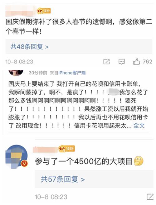 不少網(wǎng)友開始討論“十一”黃金周消費情況。微博截圖