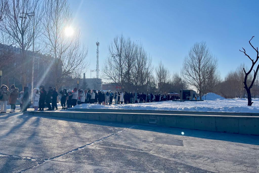 9日早上,哈爾濱氣溫低至零下20攝氏度,陳列館外早已排起長隊。為了迎接高峰,陳列館延長開放時間,游客通過網(wǎng)上預(yù)約可免費入館參觀,還有志愿者送上熱水或玉米糊幫他們驅(qū)寒。