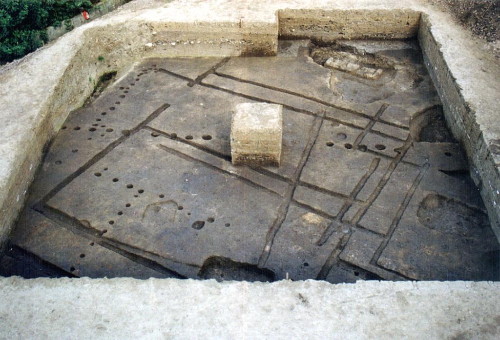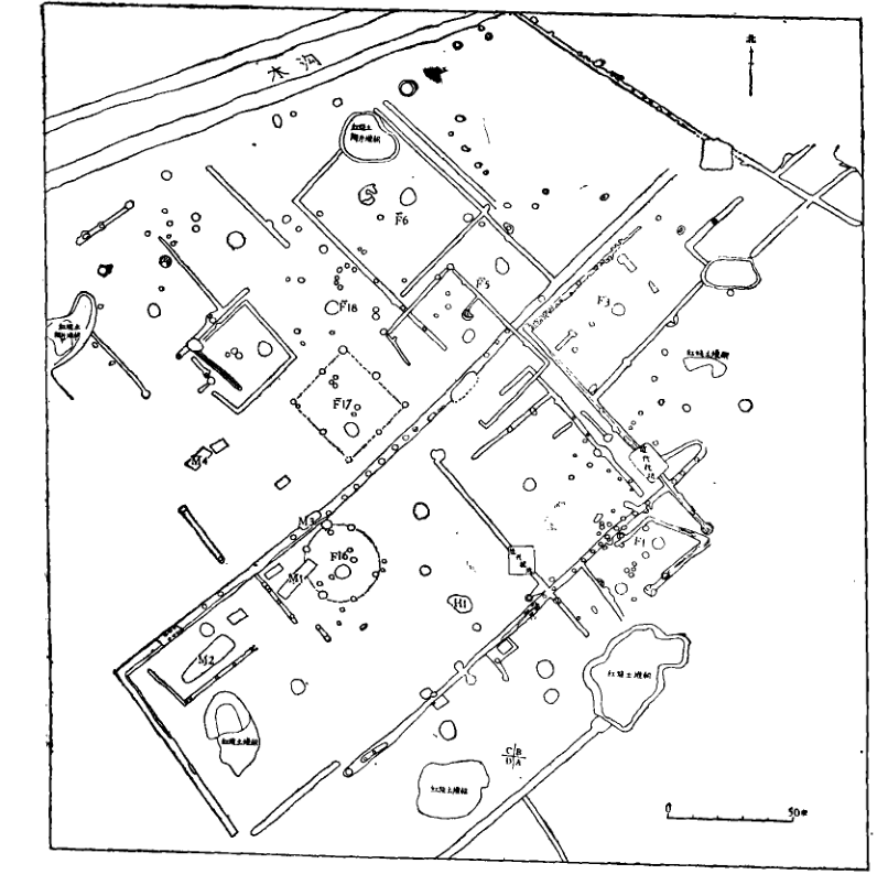 1980年11月,四川省文管會(huì)、四川省博物館與廣漢縣文化館組成聯(lián)合發(fā)掘隊(duì),在三星堆地點(diǎn)東側(cè)進(jìn)行發(fā)掘,發(fā)掘面積1100平方米,于次年5月結(jié)束工作,發(fā)現(xiàn)房址共有18座。這些房址平面形狀有方形、長(zhǎng)方形和圓形。通過對(duì)柱洞和溝槽推算,房屋面積一般在10-25平方米之間,多在一側(cè)開門,門的朝向不一,少數(shù)房?jī)?nèi)有隔墻(如F2)。居住面建在生土層上,較堅(jiān)實(shí),可能經(jīng)過踩踏或拍打,少數(shù)居住面上加了一層白膏泥。