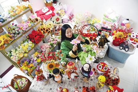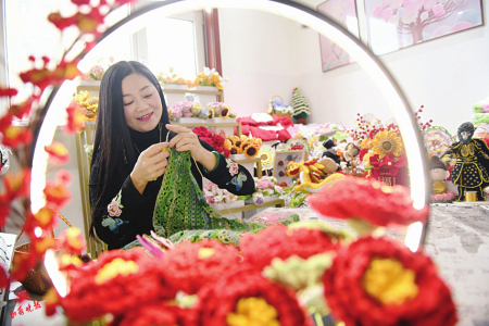 1.褚晶晶沉浸在編織創(chuàng)作中。