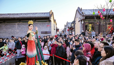 “在大同古城鬧紅火,真是年味兒十足、體驗感拉滿?!眮碜蕴挠慰蛷埼奈拈_心地說。春節(jié)假期,大同市文化活動豐富多彩,以大同古城為中心,市縣(區(qū))聯(lián)動開展的“流光溢彩迎新年”“歡歌樂舞過大年”“梨園百花賀新年”“夢幻冰雪逐夢年”“翰墨書香文化年”“古都風華盛世年”6個主題43項地方特色濃郁、群眾參與度高的文化活動,讓市民和游客目不暇接、流連忘返。在華嚴廣場、鼓樓東西街、下寺坡街、關帝廟戲臺、純陽宮廣場、大廟角、古城東南邑等處,社火巡游、過大年唱大戲、文化IP演繹、市集等活動精彩紛呈。