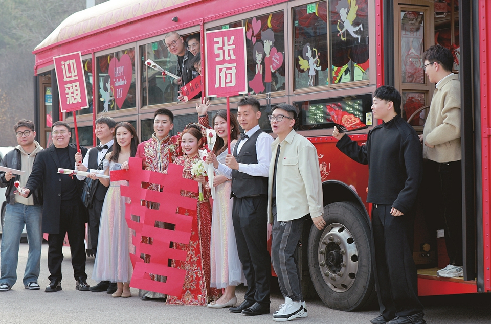 3月10日,在臨汾市區(qū)濱河路,一對(duì)新人在23路“1314”幸福主題公交巴士前拍照留念。隨著新時(shí)代婚禮習(xí)俗觀念的改變,年輕人選擇公交當(dāng)婚車,成為當(dāng)下一種時(shí)尚創(chuàng)新的婚禮形式。