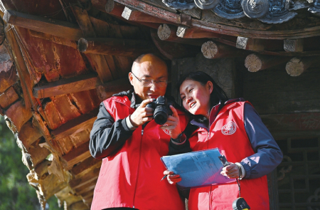 4月10日,張東星(左)、王燕燕在對(duì)山門(mén)木基層修繕痕跡拍照后進(jìn)行現(xiàn)場(chǎng)分析。