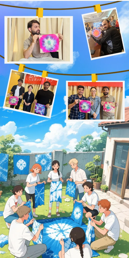 國際青年們認真聆聽扎染的歷史淵源與工藝精髓,并通過分步演示,親自體驗“絞纈”技法。留學生們在素色方巾上折疊、捆扎、浸染,創(chuàng)作出各具特色的紋樣。