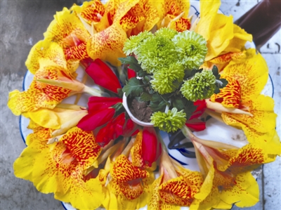 他的菜攤與眾不同,擺著五顏六色的鮮花:青菜配美人蕉、芹菜配梔子花、空心菜配菊花、香蔥配紅花……他穿著西裝、打著領(lǐng)帶賣菜,面對顧客,總是樂呵呵的。他的樂觀感動了很多人,生意因此火爆。