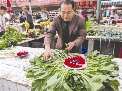 “那時孩子在成都理工大學(xué)上學(xué),家里經(jīng)濟壓力很大?!?年前,王美成接替妻子開始在城區(qū)賣菜,他發(fā)現(xiàn)有時菜并不好賣。“有一次我去酒店參加宴會,看到酒店里有的菜品裝飾挺好看,我就想是不是也可以把花裝飾在菜攤上。嘗試之后發(fā)現(xiàn)效果挺好,大家都喜歡?!?/span>