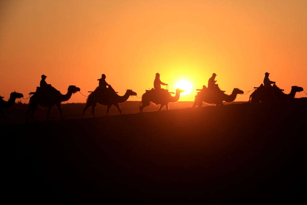 駝隊載著游客行走在鳴沙山月牙泉景區(qū)的駝道上(2023年4月24日攝)。新華社記者 陳斌 攝