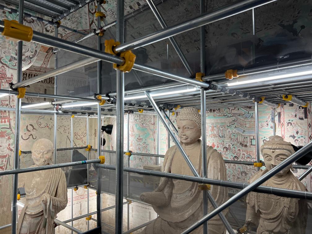 第351窟內(nèi),第四代壁畫(huà)高保真自動(dòng)拍攝設(shè)備正在對(duì)壁畫(huà)進(jìn)行分區(qū)域采集成像,400多平方米的壁畫(huà)需要采集三四個(gè)月。