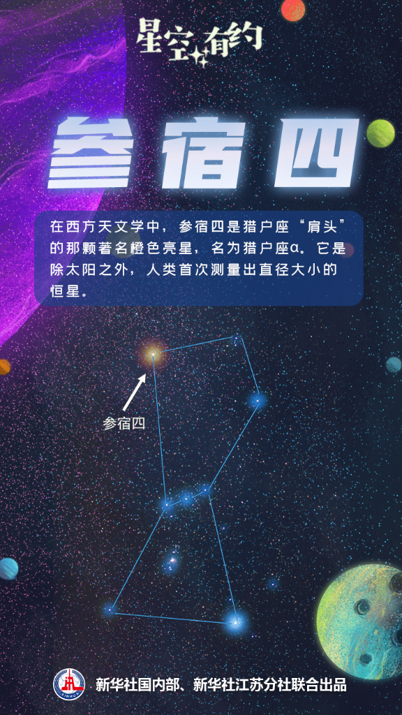 在西方天文學(xué)中,參宿四是獵戶座“肩頭”的那顆著名橙色亮星,名為獵戶座α。作為一顆紅超巨星,參宿四的半徑很大,約為太陽(yáng)半徑的幾百倍。目前它已進(jìn)入“衰老”階段,是一顆“老年恒星”。它是除太陽(yáng)之外,人類首次測(cè)量出直徑大小的恒星。