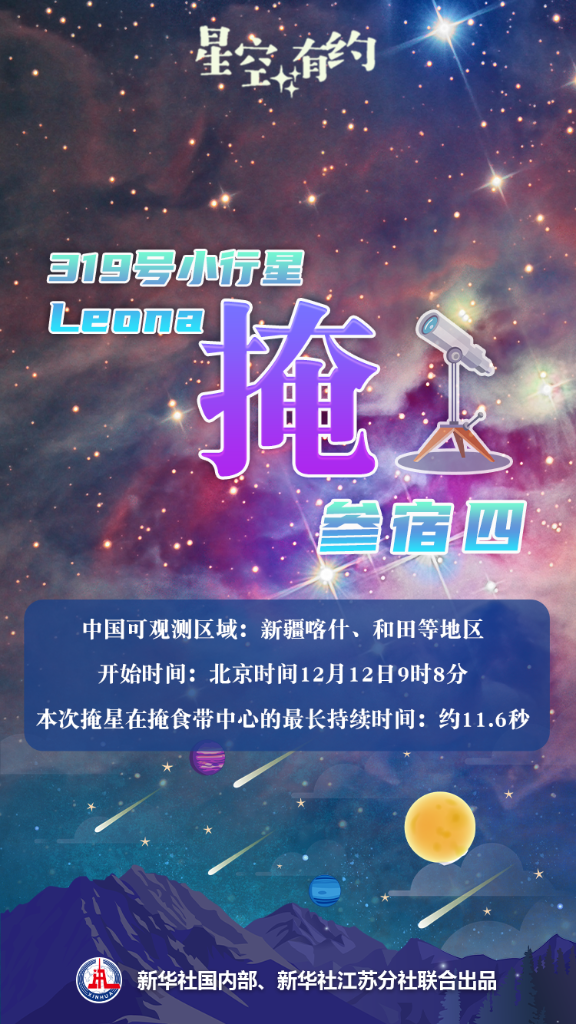 新華社南京12月10日電(記者邱冰清、秦華江)中國(guó)科學(xué)院紫金山天文臺(tái)科普主管王科超介紹,北京時(shí)間12月12日,319號(hào)小行星Leona將掩恒星參宿四。最早能看到本次掩星過程的是中國(guó)新疆喀什、和田等地區(qū),開始時(shí)間是當(dāng)日9時(shí)8分。本次掩星在掩食帶中心的最長(zhǎng)持續(xù)時(shí)間約為11.6秒。